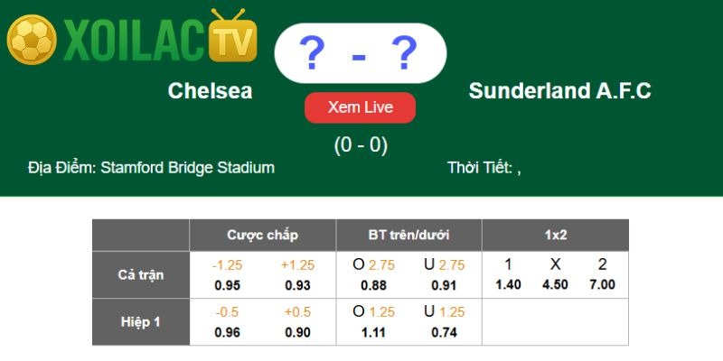 Bảng tỷ lệ kèo trận Chelsea – Sunderland