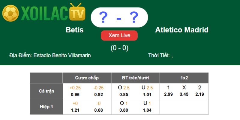 Bảng tỷ lệ kèo trận Real Betis – Atlético de Madrid chi tiết